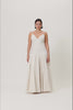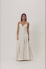 Léon maxi dress in créme white, designed with a fitted bodice and flattering V-neckline. It features thin adjustable shoulder ties and an open back with elegant tie closures for a romantic touch. The dress falls into a voluminous, gathered skirt with an asymmetric drop waist.
