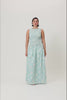 The Madrid dress in tropical blue features a sophisticated boat neckline, asymmetric cutline with frill detailing. Smocked at the bust for a flattering, comfortable fit, it flows into a voluminous skirt with an A-shaped hip cut to enhance the silhouette.