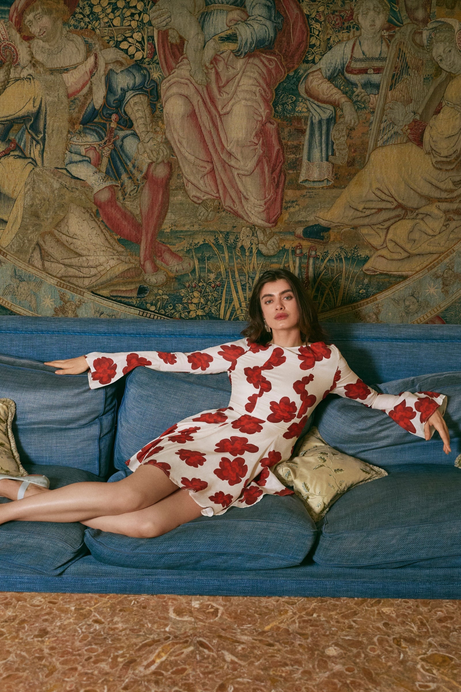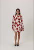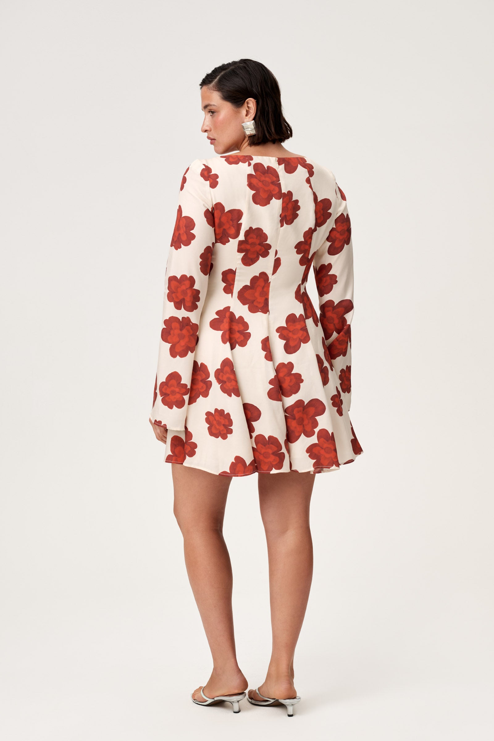 Riom mini dress in red flower features a cinched waist and voluminous silhouette for a playful, flattering fit. The boat neckline and trumpet sleeves add movement and drama, while the back zipper ensures a smooth finish.
