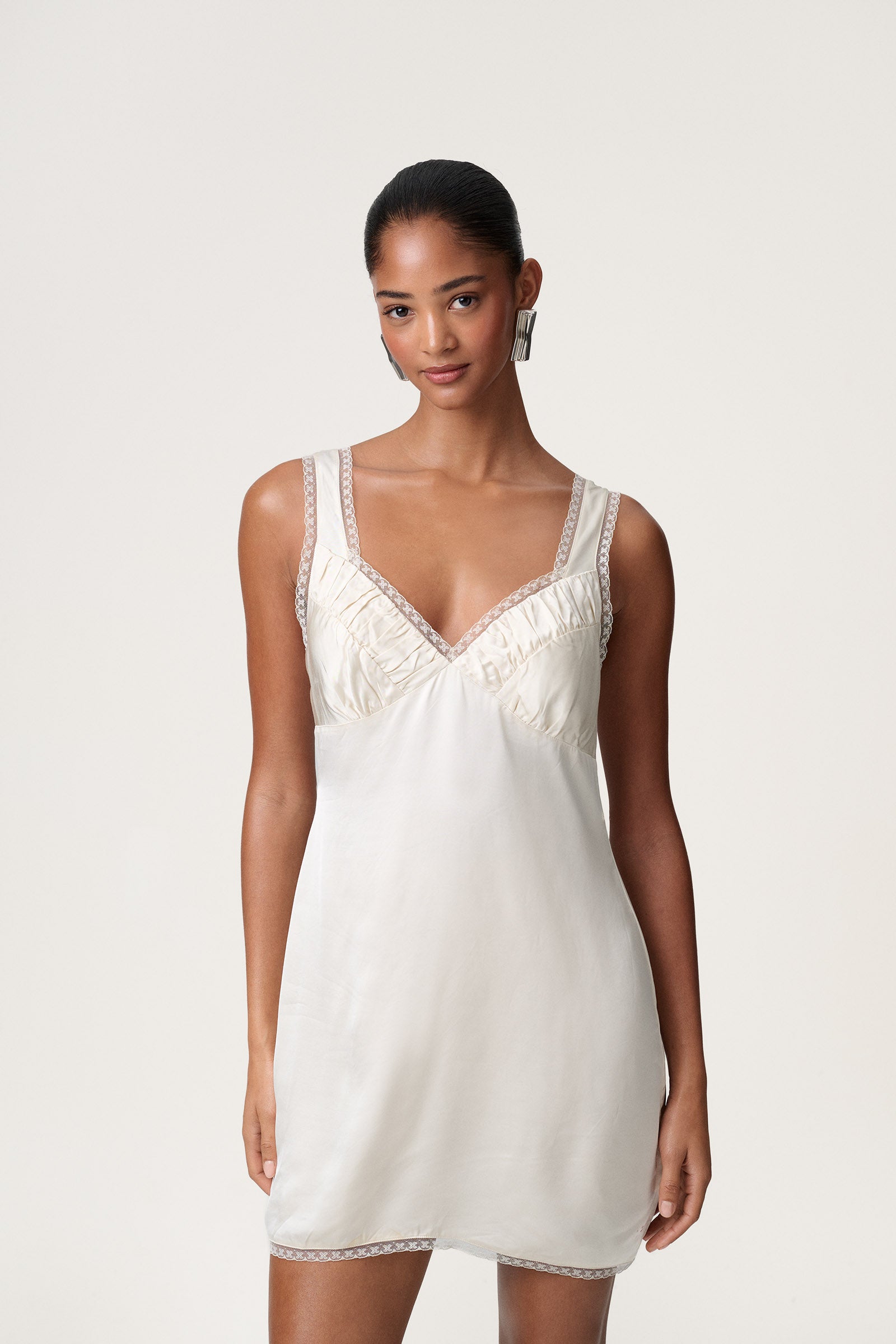 The Sassari negligé in ivory features a softly gathered bust, defined waist, and adjustable spaghetti straps for a flattering silhouette, finished with delicate embroidered mesh edging. Paired with the Sassari robe, designed with dropped shoulders and an adjustable waistband, and finished with embroidered details for an effortlessly feminine look.