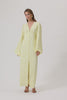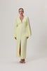 Positano maxi dress in pastel yellow. The dress has buttons and slits at the front, bold long sleeves, and a V-necked collar. The body is fully lined, has a hidden zipper at the back, and is full-length.
