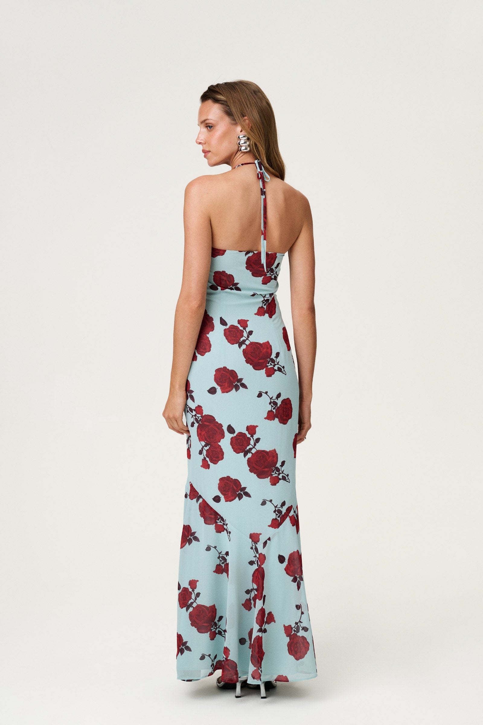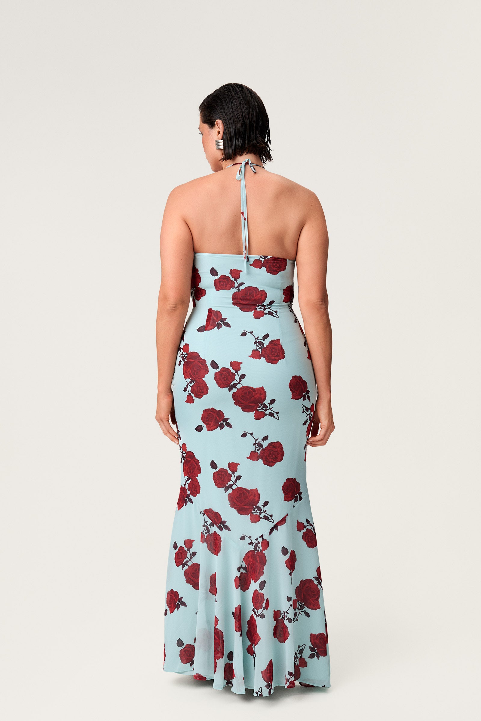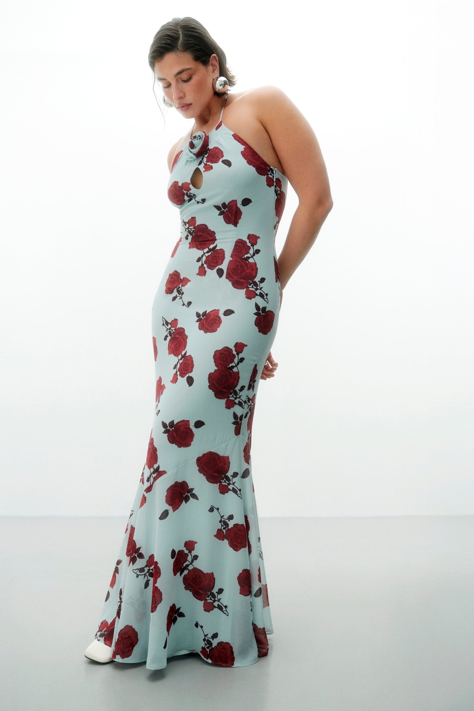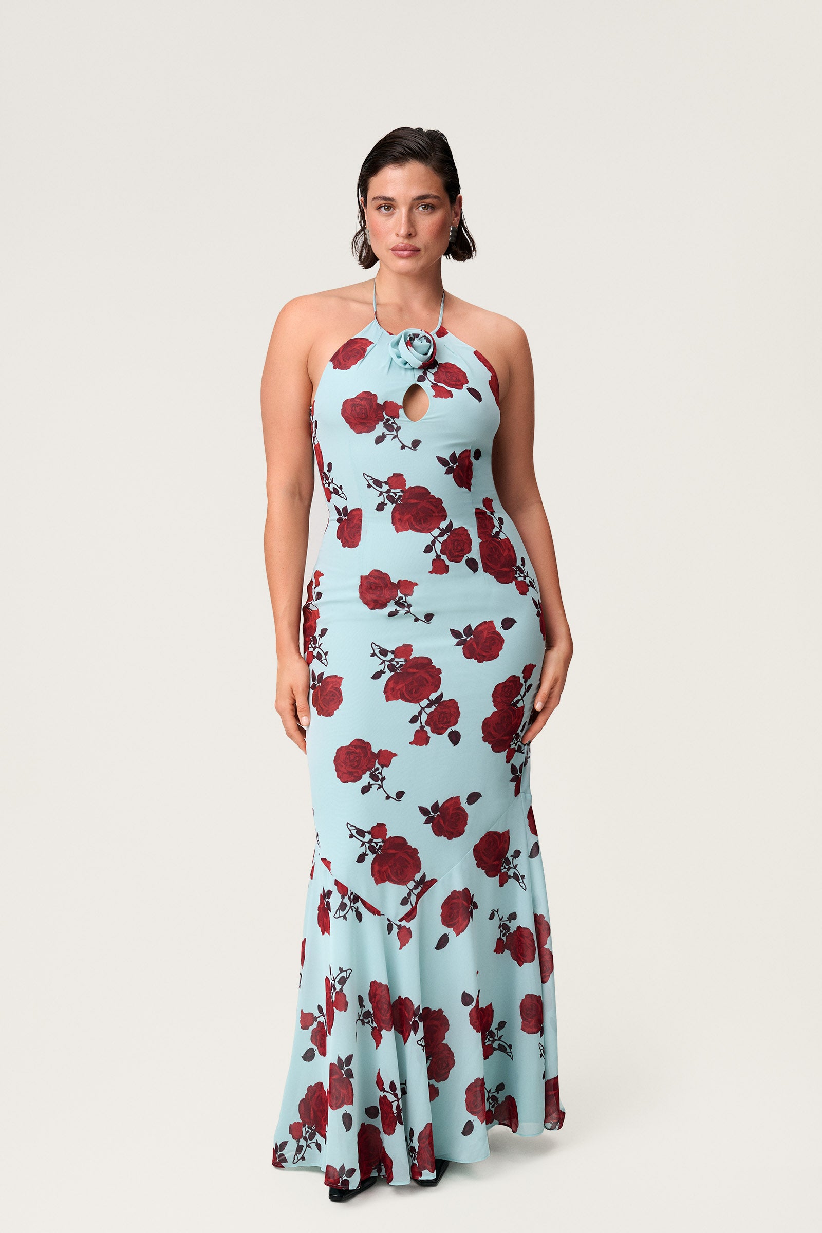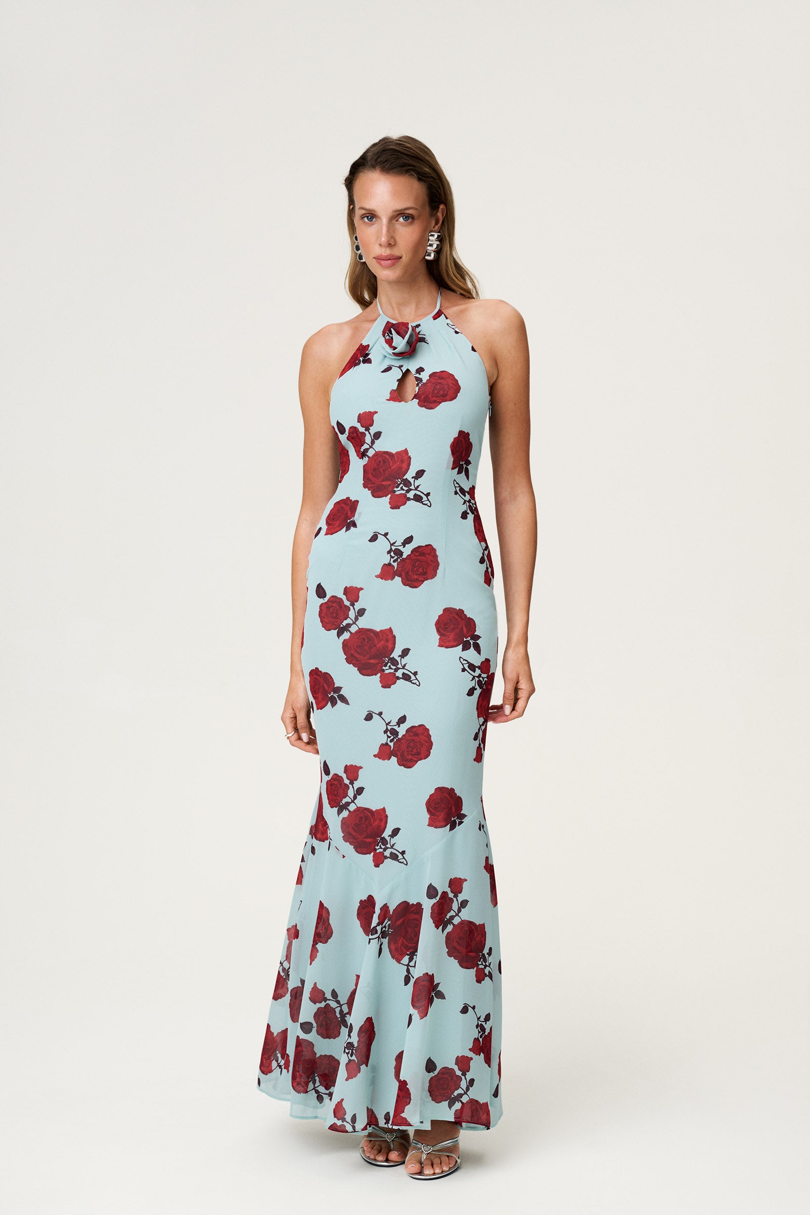 Rozzano maxi dress in mint features a front cut-out adorned with a rose detail, a tie-back design, and a mermaid fit for an elegant silhouette. Fully lined with a hidden side zipper for a seamless finish.