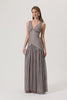 Toulouse maxi dress in white and brown gingham. Featuring a V-neckline front and back, hidden zipper in back, subtle bust ruching, a high front slit, and a pleated skirt for elegance. The A-shaped hip cut enhances the silhouette.