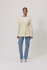 Alba blazer in butter beige features a V-neckline, welt pockets, full-length sleeves, and a slanting shoulder, crafted in textured knit with a slim waist and back slit. Paired with the Agra skirt, a straight-cut piece that sits low on the hips with a relaxed fit, high front slit, and waist loops, crafted in matching textured knit for a chic, sophisticated look.