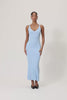 Lugo maxi dress in light blue features a maxi length, a defined waist for an elegant silhouette, and a mermaid-fit skirt that enhances the figure. Paired with the Lugo cardigan designed with structured shoulder pads and a defined waist for an elegant silhouette. The full-length sleeves are finished with wide cuffs for a refined touch.