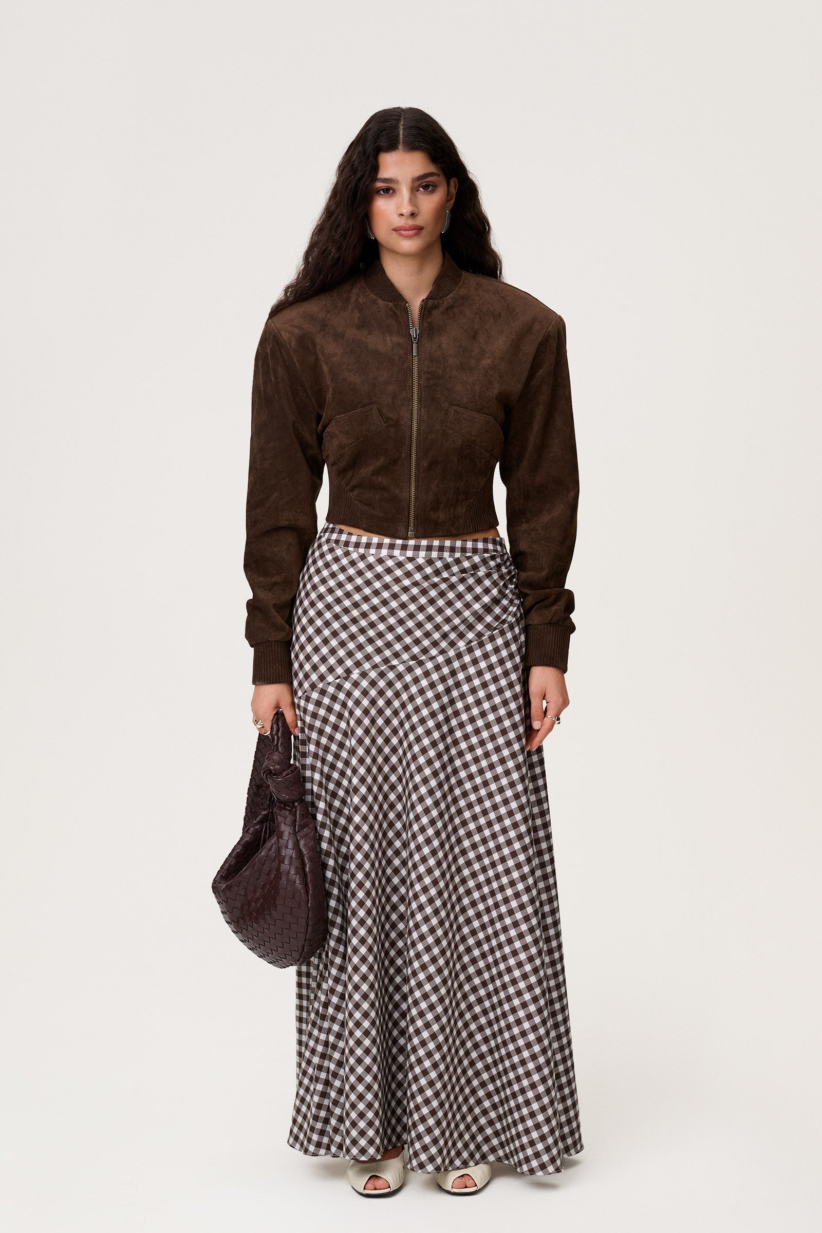Taormina maxi skirt in brown gingham. Designed with an asymmetric cut line and ruffle detail on the right side for a modern, textured look. Features a flattering A-line silhouette, side zipper for a secure fit, and is fully lined for comfort and structure.