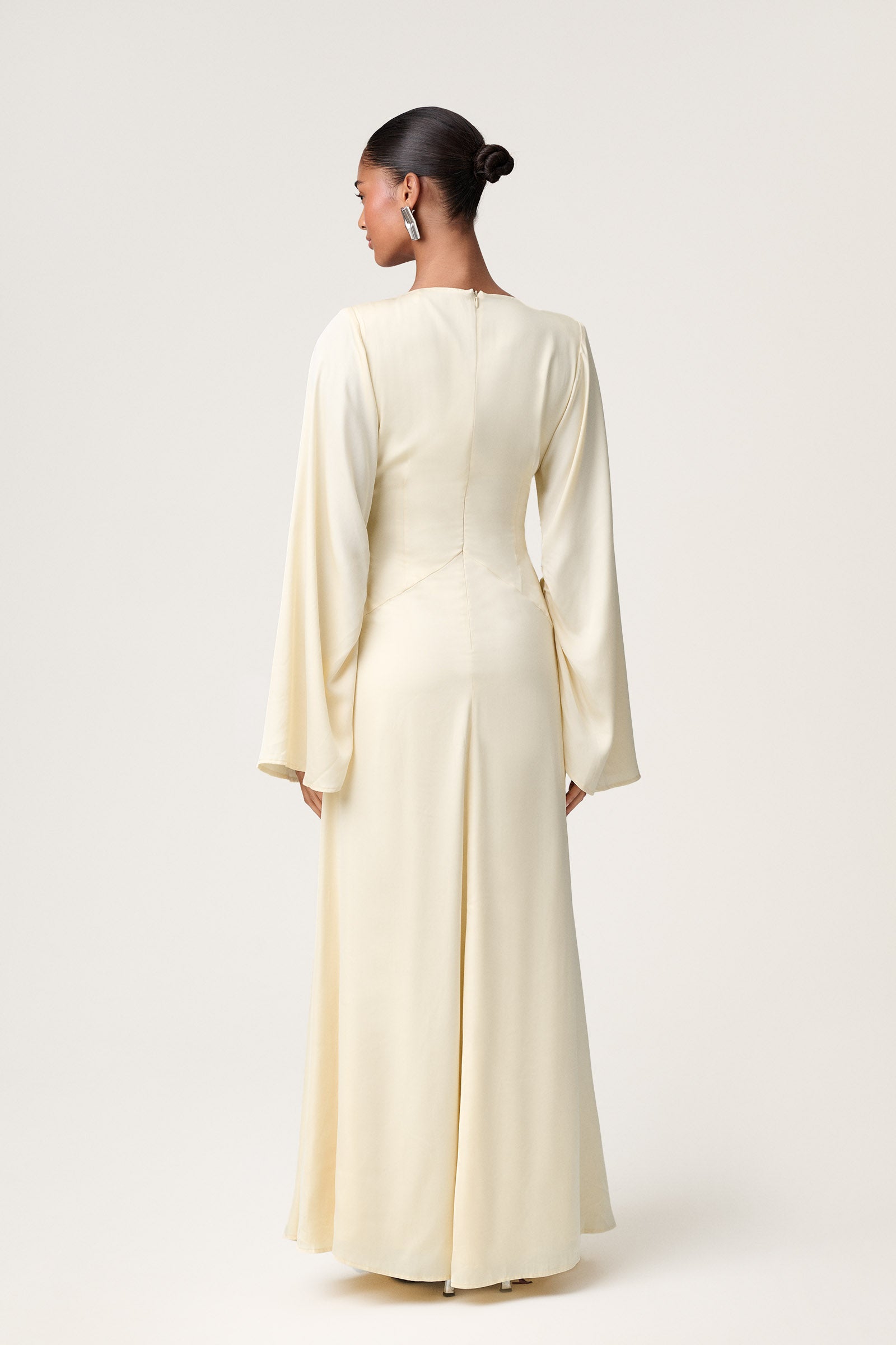 Barletta maxi dress in vanilla yellow, designed with soft gathering and a V-shaped seam below the chest for a flattering silhouette. Designed with a subtle shoulder pad, a voluminous gathered sleeve for an asymmetric look, and finished with a hidden zipper at the back.