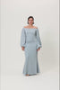 Reno maxi dress in dusty blue. This dress has an off-shoulder fit and full length balloon sleeves. It comes in a maxi length and features decorative ruched waist detail to create a flattering silhouette.