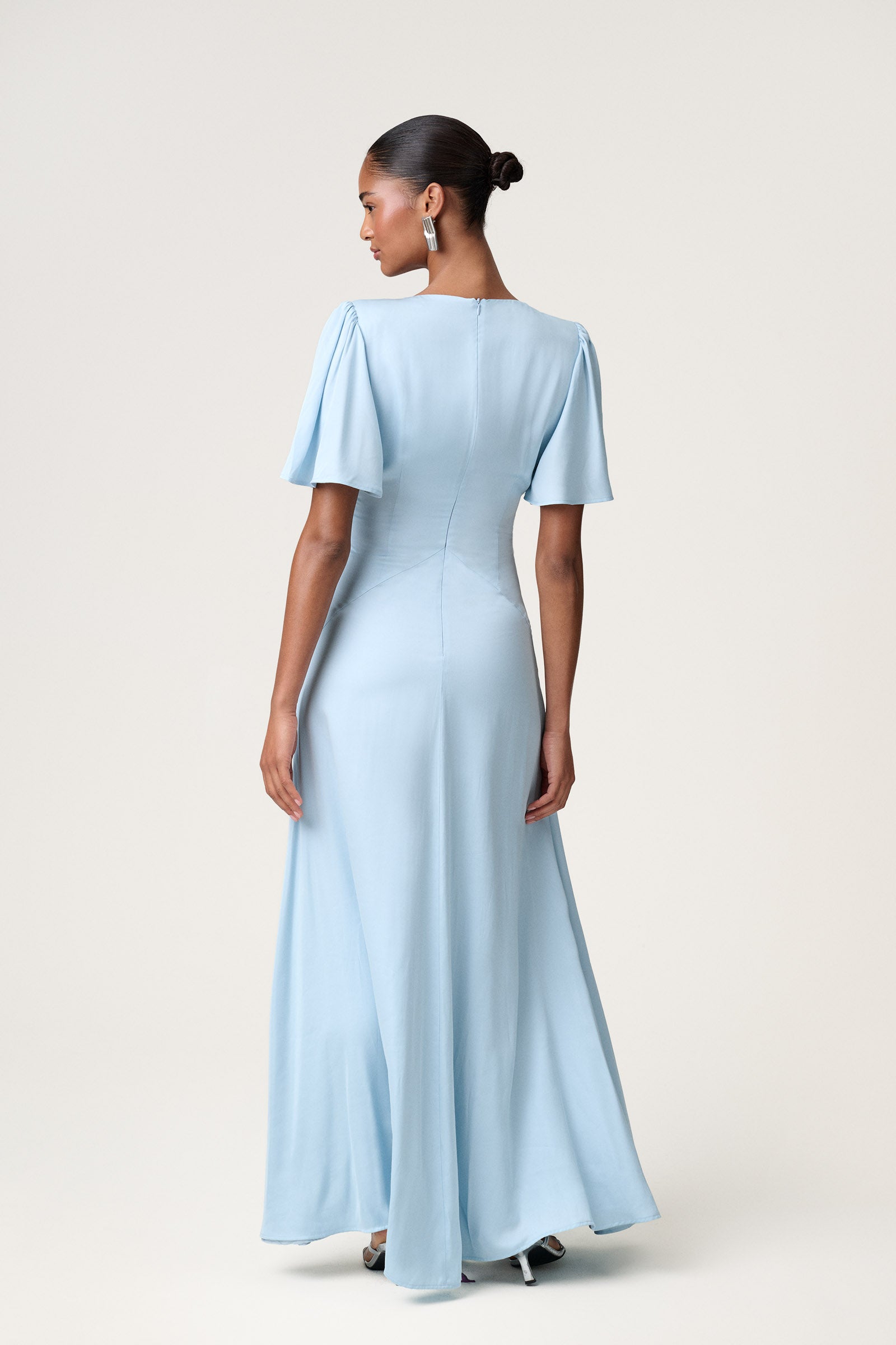 Bari maxi dress in light blue, designed with soft gathering and a V-shaped seam below for a flattering silhouette. Designed with a subtle shoulder pad, short flutter sleeves, and finished with a hidden zipper at the back.