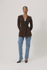 The Alba blazer in dark brown suede features a V-shaped neckline, welt pockets, full-length sleeves, and a slanting shoulder. The blazer is designed to be slimmer in the waist and has a slit at the back.