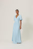 Bari maxi dress in light blue, designed with soft gathering and a V-shaped seam below for a flattering silhouette. Designed with a subtle shoulder pad, short flutter sleeves, and finished with a hidden zipper at the back.