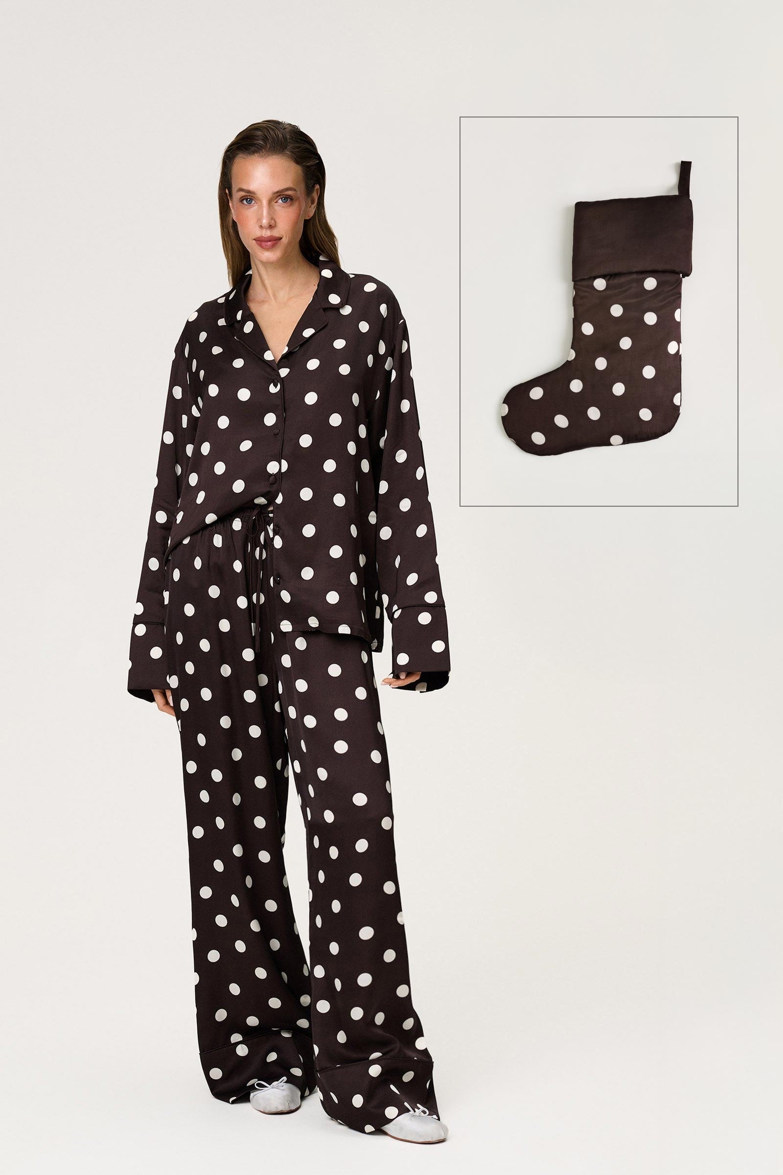 Elevate the season with The Holiday Luxe Set, pairing our silky Aspen Pyjama Set with the charming Antwerpen Christmas Stocking in brown dot.