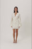 Florence mini dress in white with a red floral print. The dress has wide balloon sleeves, a V-shaped neckline and buttons along the front. It has a hidden zipper in the back, is fully lined in the body and has an hourglass silhouette.