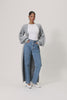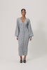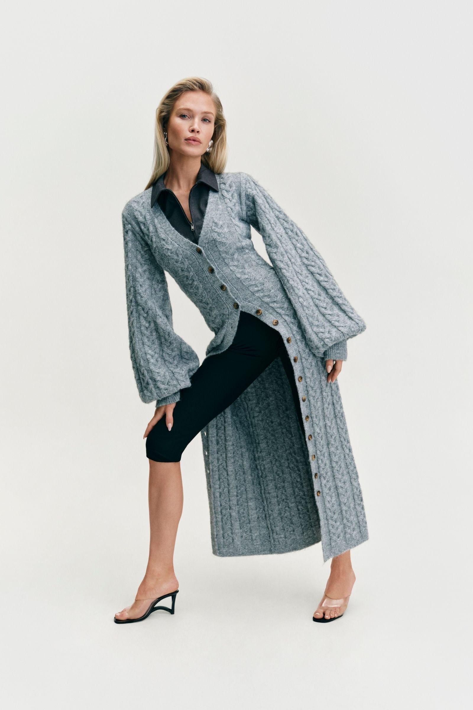 Montana maxi dress in light grey melange is an hourglass fitted dress, crafted from a cozy knitted fabric. It features a front button-up closure, a V-neck collar, and full-length balloon sleeves with distinctive cuffs. Please note that this version of the Montana dress is made in a cable-knit fabric, offering a more textured and elevated look.