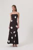 Varna midi dress in brown with white dots. The dress features adjustable shoulder straps, a straight neckline, and a bell bottom skirt for comfort and flowy movement. The body is fully lined.