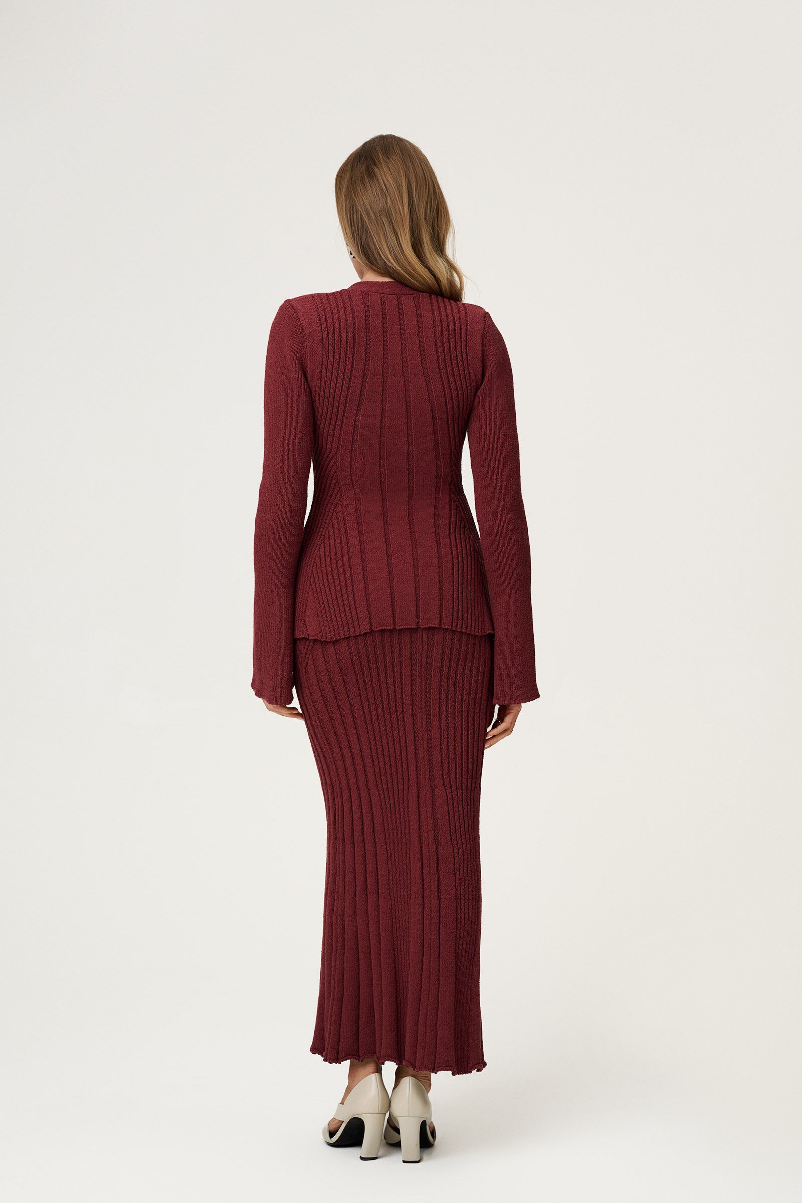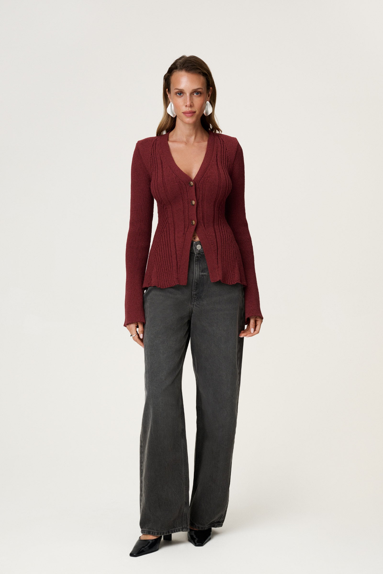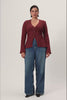 Lugo cardigan in burgundy, designed with structured shoulder pads and a defined waist for an elegant silhouette. The full-length sleeves are finished with wide cuffs for a refined touch.
