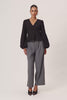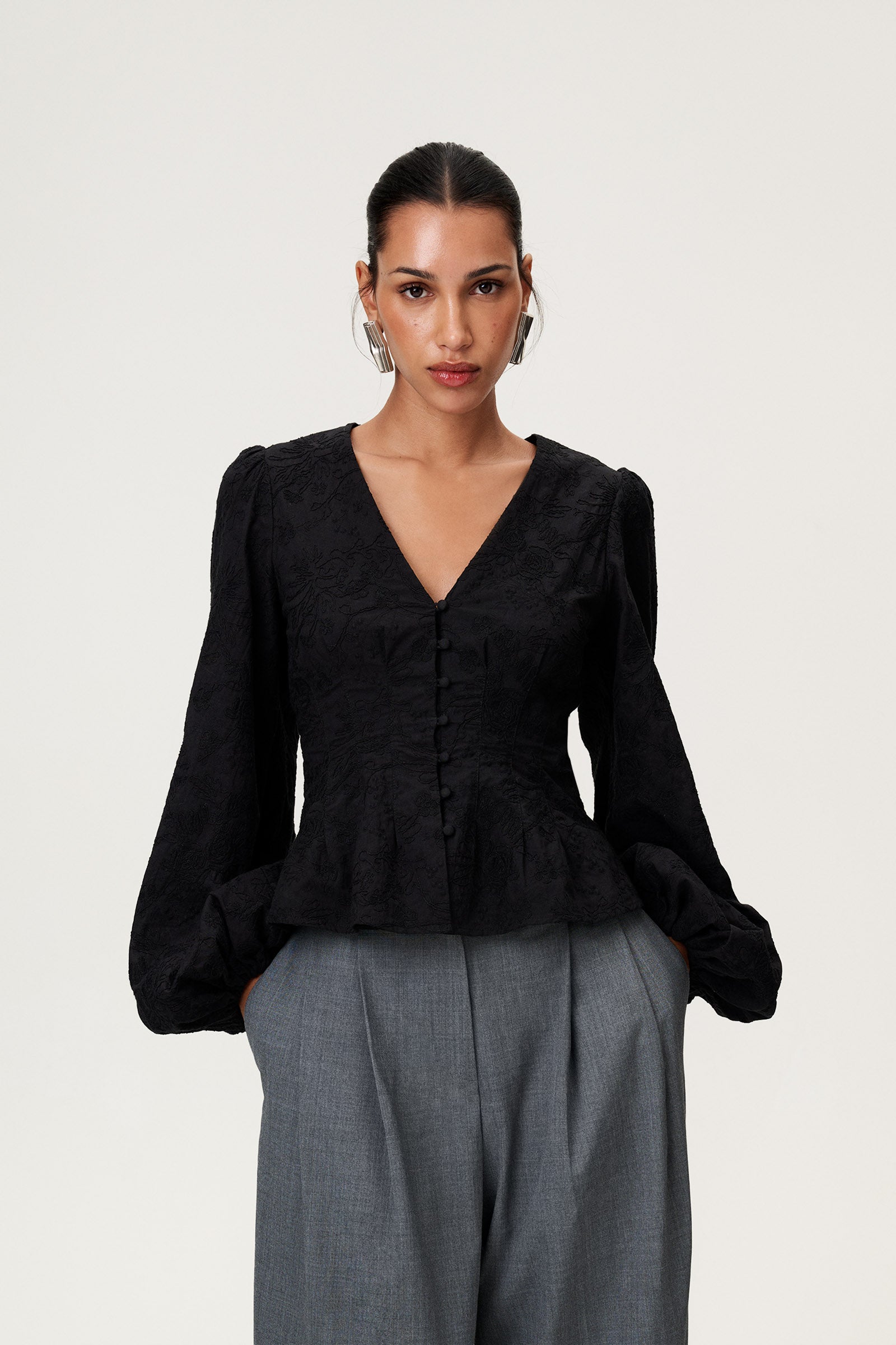 Palena blouse in black embroidery features buttons and a slits at the front, bold long sleeves, and a V-necked collar. The body is fully lined.