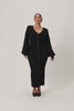 Montana maxi dress in black is an hourglass fitted dress, crafted from a cozy knitted fabric. It features a front button-up closure, a V-neck collar, and full-length balloon sleeves with distinctive cuffs.