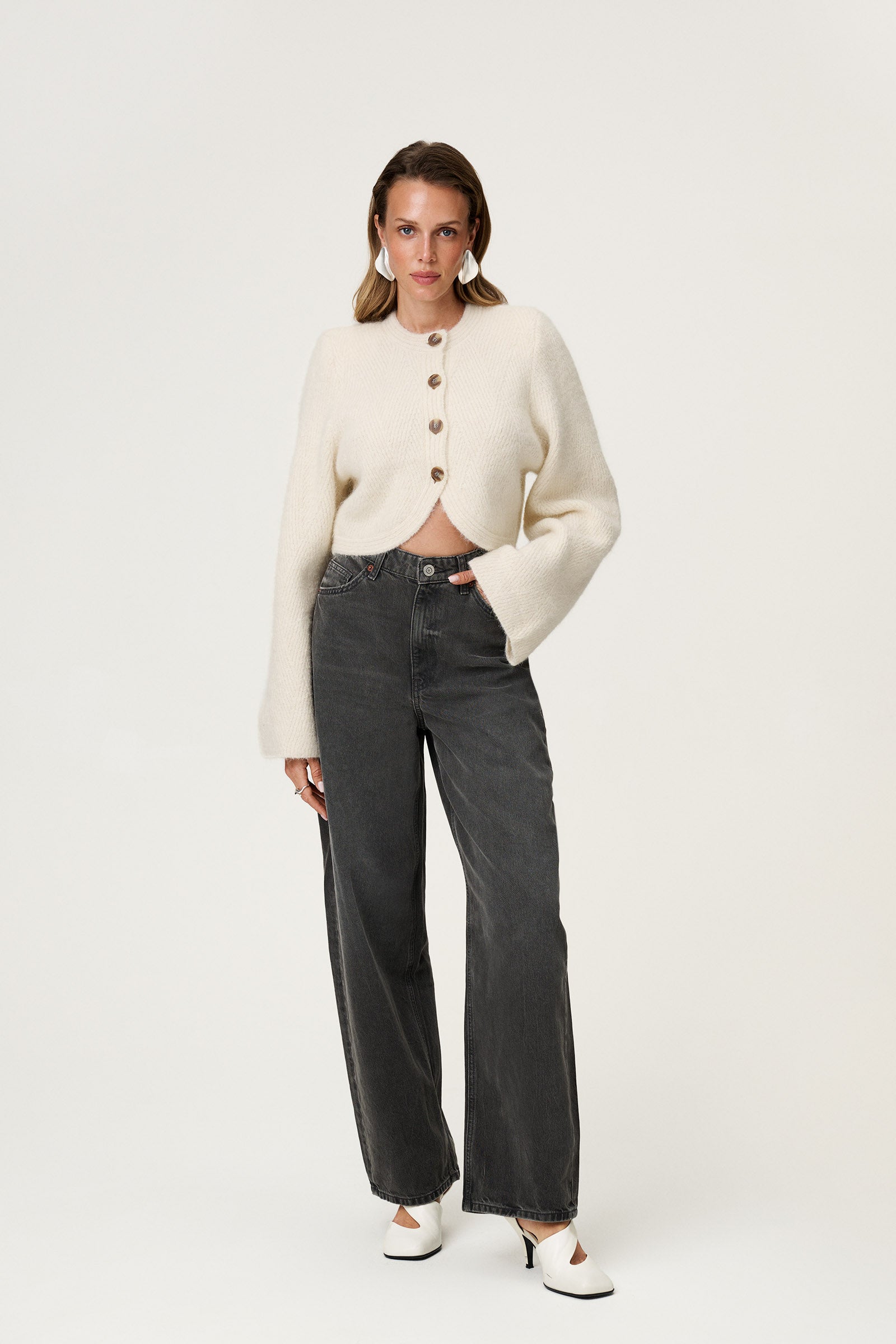 Cessole cardigan in off-white featuring Adoore signature buttons, structured shoulder pads, and straight-cut sleeves. The cropped silhouette adds a refined finish to both casual and dressed-up looks.