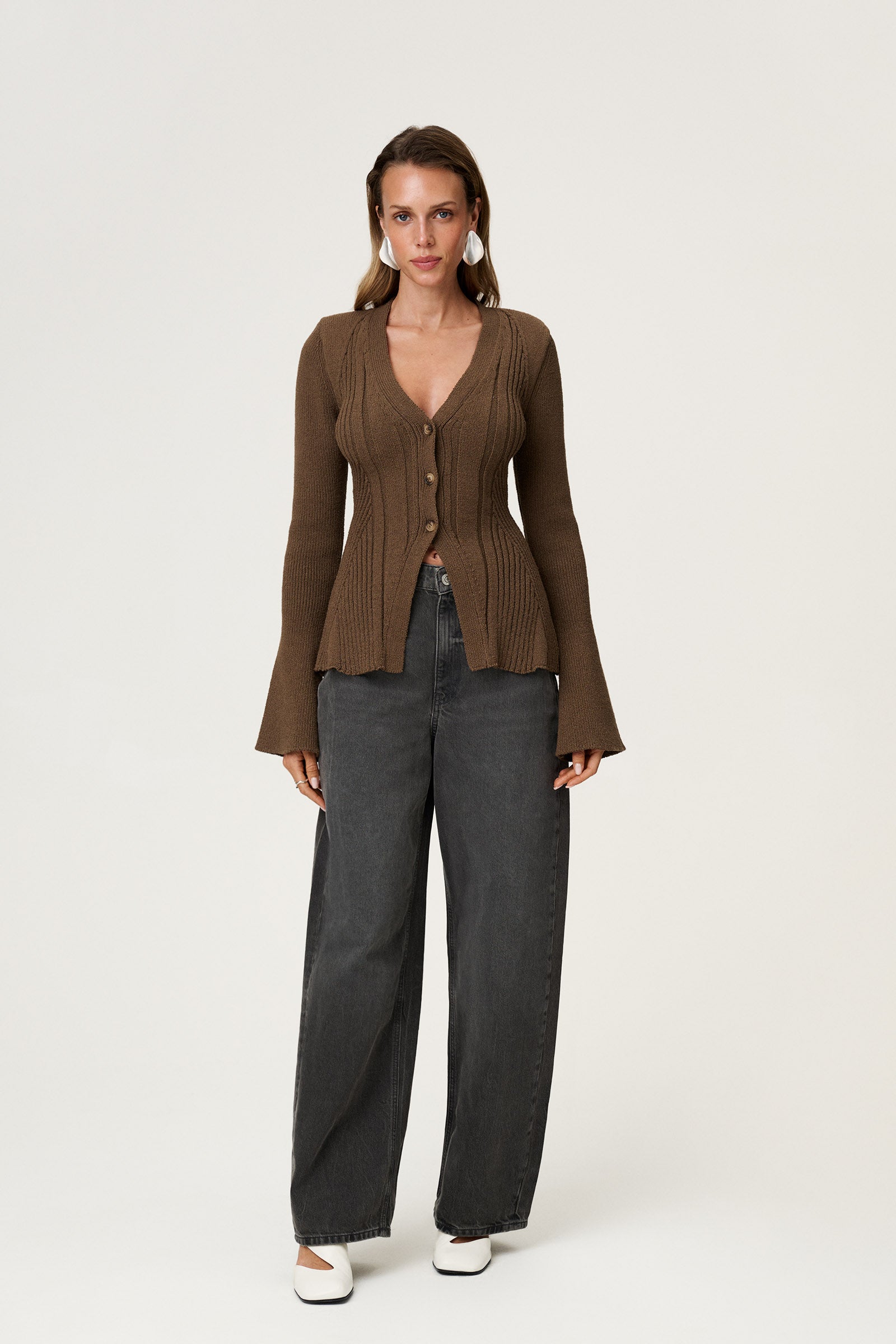 Lugo cardigan in taupe, designed with structured shoulder pads and a defined waist for an elegant silhouette. The full-length sleeves are finished with wide cuffs for a refined touch.