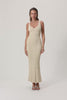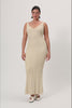 Lugo maxi dress in butter beige features a maxi length, a defined waist for an elegant silhouette, and a mermaid-fit skirt that enhances the figure.