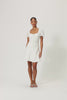 Sorrento mini dress, designed with soft puff sleeves, a gathered front, and a defined bust detail for a feminine silhouette. Finished with decorative front buttons, a flared skirt, and a concealed back zipper.