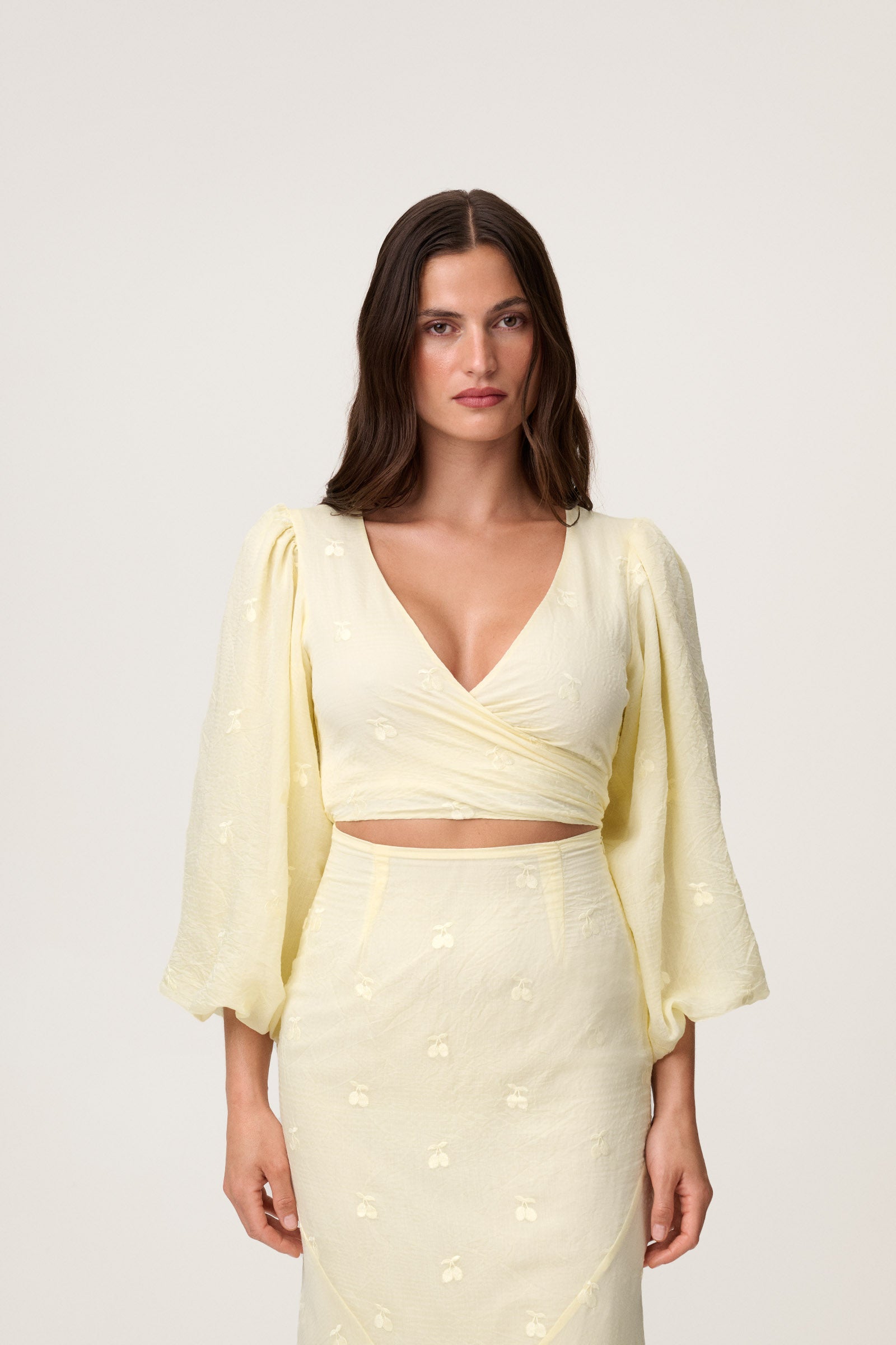 Toscana maxi dress in pastel yellow with embroidery features a V-neckline, hourglass fit, balloon sleeves, and zipper on the side. It is designed with a wrap-around function at the waist, allowing for an adjustable fit. This detail gives the illusion of a two-piece set from the front while maintaining the appearance of a dress from the back.