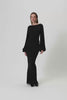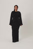 Rennes maxi dress in black features a high rounded neckline and a square back with a tie detail. The full-length design includes stylish side ruching for a flattering fit. With an hourglass silhouette, full-length balloon sleeves, and a back slit, this dress is perfect for any occasion.