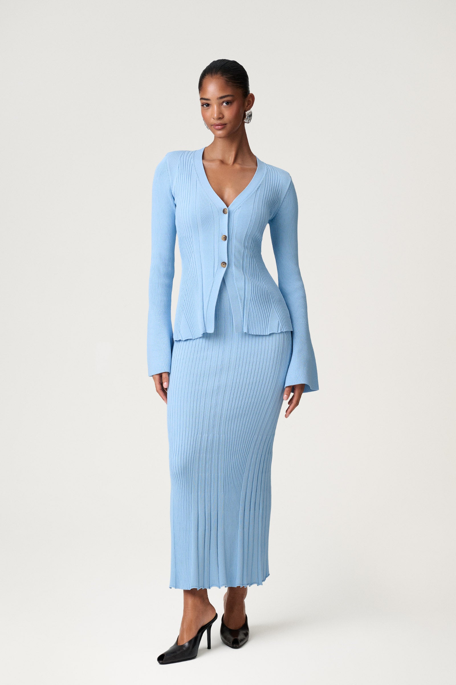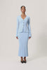 Lugo cardigan in light blue, designed with structured shoulder pads and a defined waist for an elegant silhouette. The full-length sleeves are finished with wide cuffs for a refined touch.