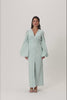 Positano maxi dress in mint embroidery. The dress has buttons and slits at the front, bold long sleeves, and a V-necked collar. The body is fully lined, has a hidden zipper at the back, and is full-length.